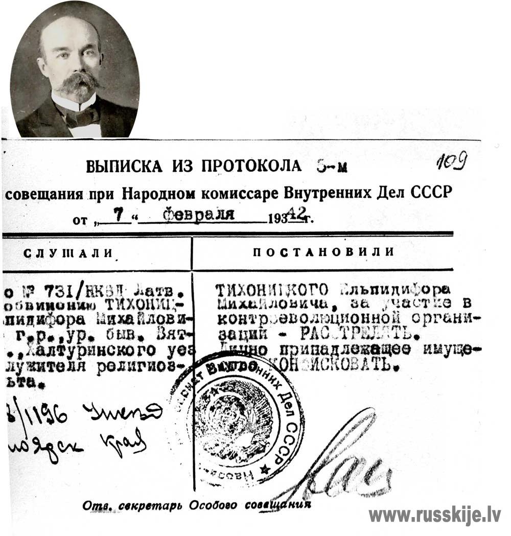 Е.М. Тихоницкий был арестован органами НКВД 14 октября 1940 года по обвинению в «контрреволюционной деятельности», за то, что до революции состоял в партии народных социалистов, а проживая в Латвии, поддерживал связь с Трудовой крестьянской партией в Праге.